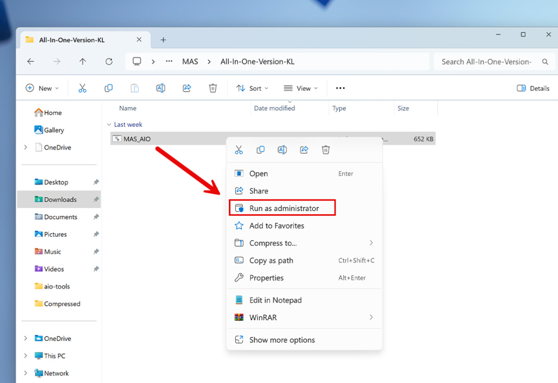 **ขั้นตอนที่ 4:** คลิกขวาที่ไฟล์ MAS_AIO แล้วเลือก **Run as Administrator**